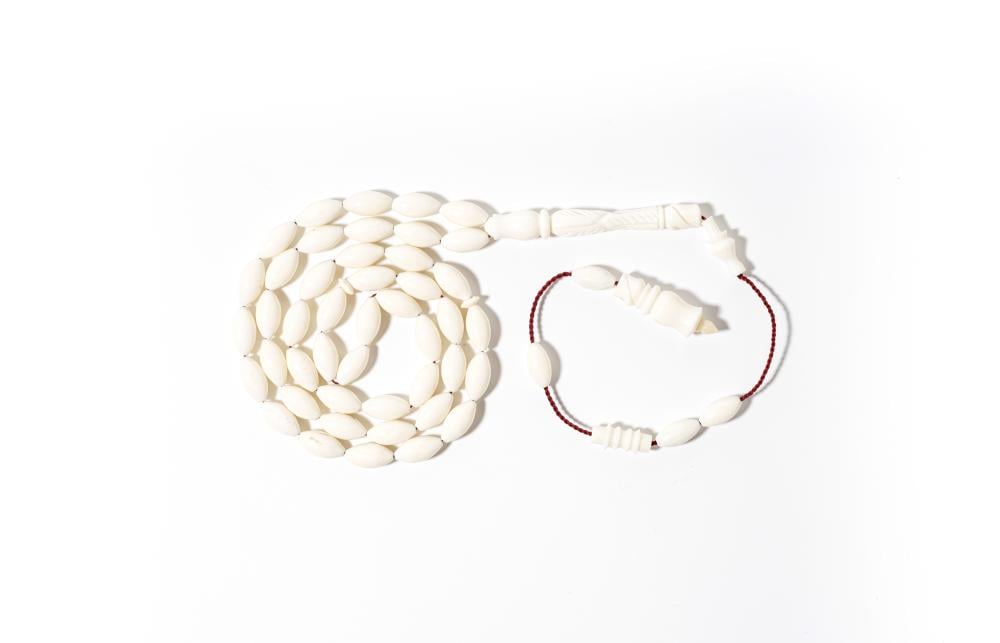 ٣٥٠مسباح عظم تمليكة خراطة يدوية وشاهد مزخرف يدوياً وبخيط احمر داكن ( عنابي)